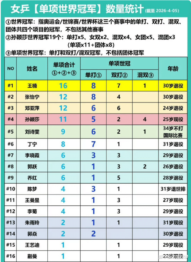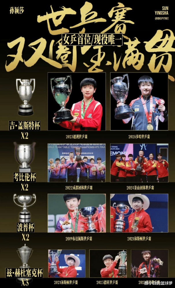 25岁孙颖莎已经拿到了19个世界冠军:单打5冠、女双两冠、混双4冠、女团5冠、混团3冠,目前孙颖莎仅比邓亚萍、张怡宁、王楠三人更少,孙颖莎是现役运动员她还有希望继续创造更多的纪录。