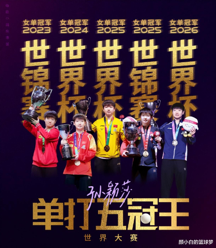 孙颖莎目前有5个单打世界冠军:2023年世乒赛、2024年世界杯、2025年世乒赛、2025年世界杯、2026年世界杯,他只差一个奥运会女单冠军就实现大满贯。