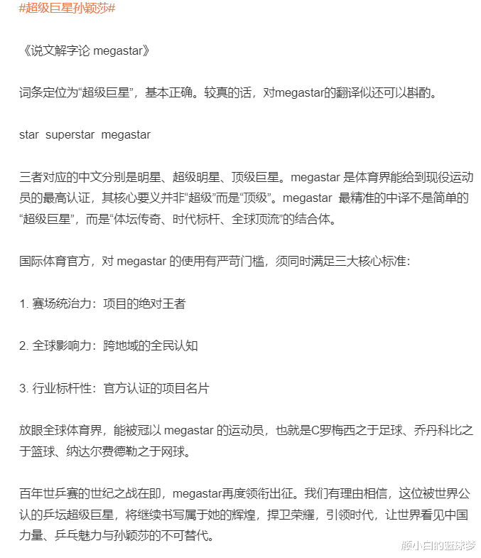 有大V解释了megasta这个词语不单单是“超级巨星”而已,star(球星)superstar(超巨巨星)、megastar(顶级巨星),这是体育界给现役运动员最高认证,其核心并非超级而是顶级,megastar 最精准的中译不是简单的“超级巨星”,而是“体坛传奇、时代标杆、全球顶流”的结合体。