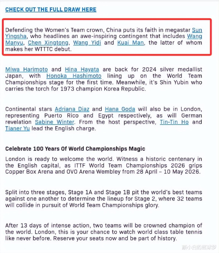 文中有一段写道:女团卫冕冠军中国队派出超级豪华阵容,由超级巨星孙颖莎领衔,队员还有王曼昱、陈幸同、王艺迪、蒯曼等超级强手。